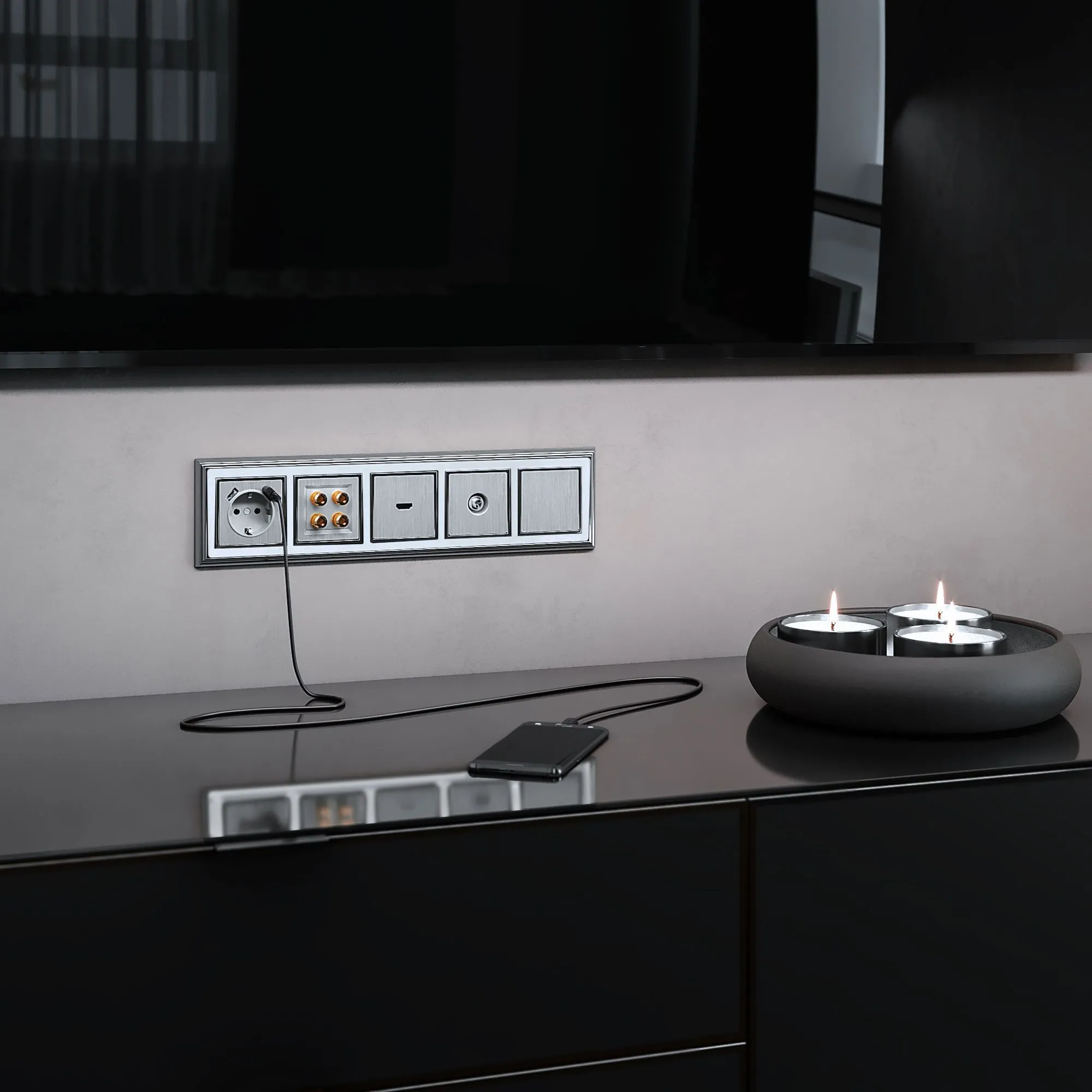 Скрытая установка аудио розетки и отсутствие внешних проводов не нарушает эстетический вид интерьера. Механизм с суппортом из нержавеющей стали монтируется в подрозетник и надежно фиксируется с помощью винтов и распорных лапок. Внешняя лицевая панель выполнена из высококачественного поликарбоната, обладающего ударопрочностью и термостойкостью.