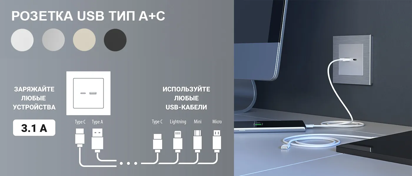 Розетка с разъемами USB Type-А + USB Type-C позволит забыть о поисках нужного переходника для обычной розетки. Наш механизм можно просто и удобно установить в подрозетник и ограничиться наличием кабеля. Максимальная сила тока, подаваемая на USB-розетку — 3,1 ампера.
